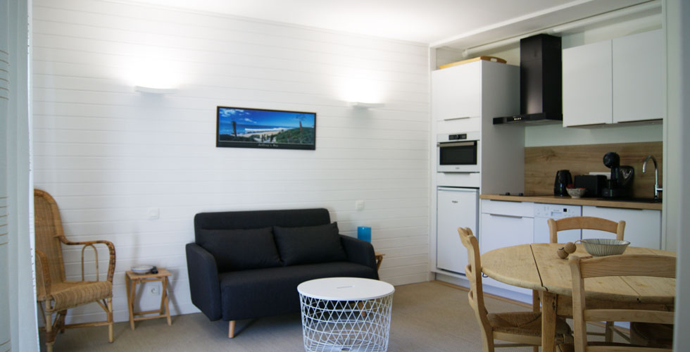 - d'une belle pièce de vie avec cuisine équipée (lave-vaisselle, four micro-onde, machine à café à dosette, télévision, canapé lit …),